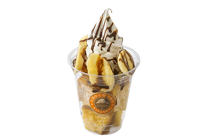 ひとくちサイズのデニッシュフレンチトーストに、相性抜群チョコソースとフレッシュバナナの王道の組み合わせ。カップ入りで食べ歩きにも♪