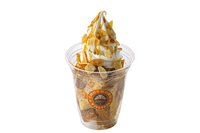 ひとくちサイズのデニッシュフレンチトーストに、濃厚ソフトクリームとローストナッツ、メープルソースをトッピング。カップ入りで食べ歩きにも♪