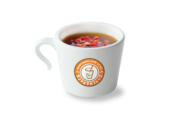静岡県産「べにふうき」の和紅茶に、果肉感たっぷりのりんごソースを合わせました。アクセントのいちごが、和紅茶のまろやかな風味ともよく合います。