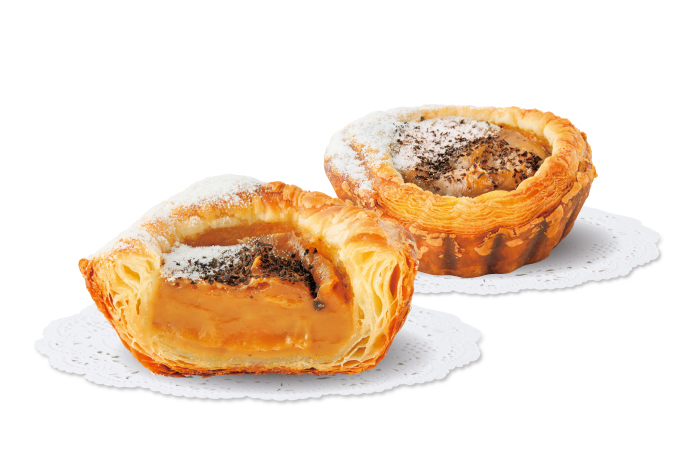 クロワッサン生地で作るお店仕込みのエッグタルト。バニラの香りと卵の風味が豊かなカスタードクリームを、たっぷりと絞り焼き上げました。